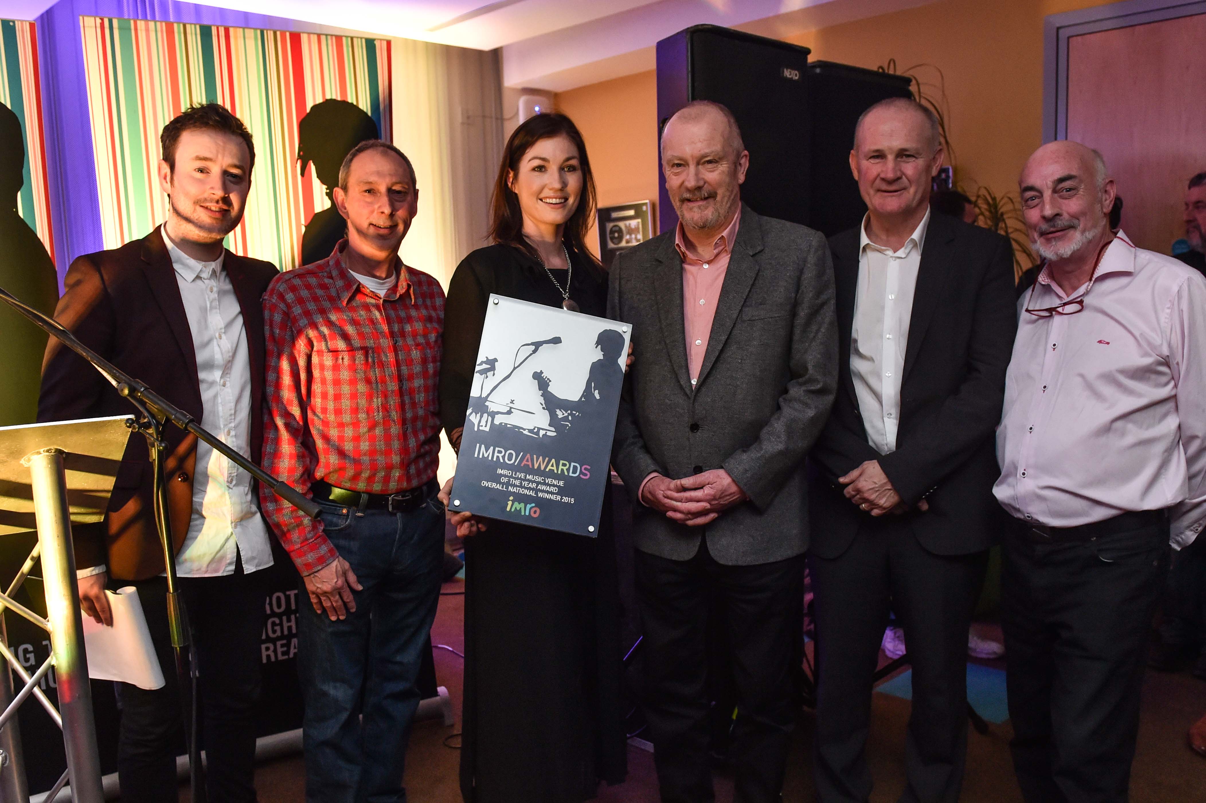 Andrea Keogh accepting the IMRO Live Music Venue 2015 Award on behalf of The Set Theatre, Kilkenny with Paddy McKenna, Steve Lindsey, Keith Donald, Victor Finn and Johnny Lappin.